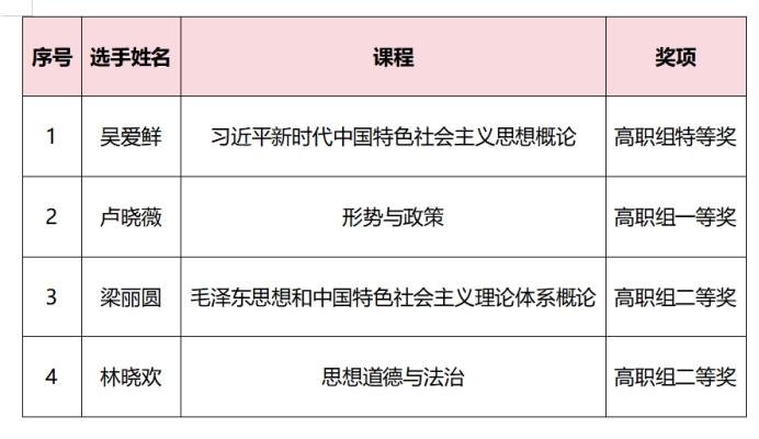 (马克思主义学院 讯 邓锐、吴爱鲜/文)近日,自治区教育厅公布了2025年全区高校思政课教师教学基本功比赛获奖名单。我校收获高职高专组1个特等奖、1个一等奖,2个二等奖的好成绩。