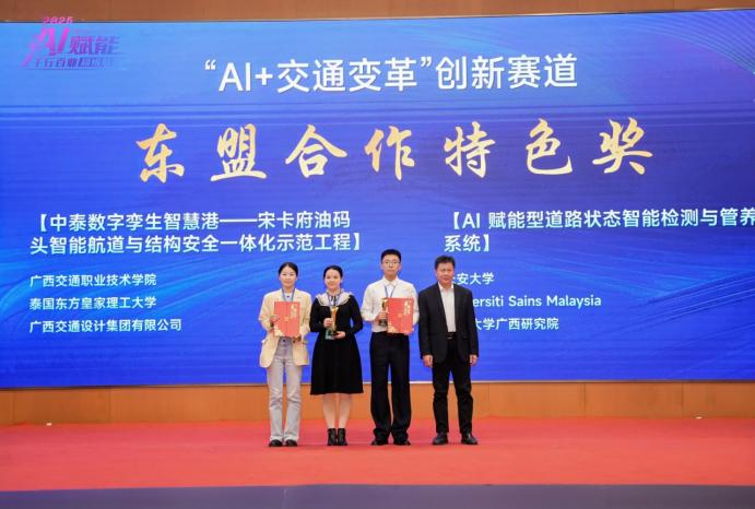 2025年12月,两校联合研发的《中泰数字孪生智慧港—宋卡府油码头智能航道与结构安全一体化示范工程》项目,在AI赋能千行百业超级联赛交通行业创新大赛中斩获东盟合作特色奖,成为双方在交通人工智能领域合作的典范成果,也为泰国分中心的落地奠定了坚实的技术与合作基础。