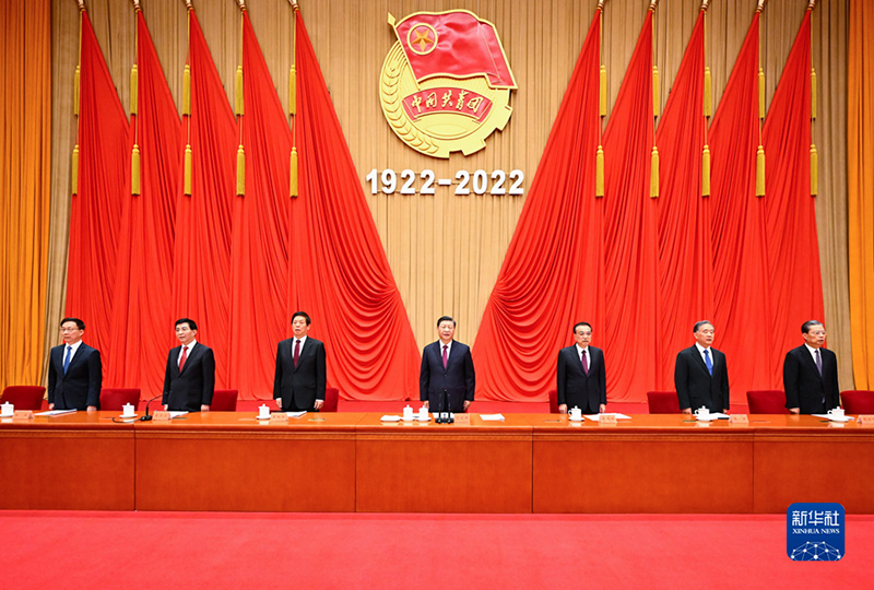 人民大会堂二层宴会厅气氛隆重热烈。主席台上方悬挂着“庆祝中国共产主义青年团成立100周年大会”会标,后幕正中悬挂团徽,团徽下方是“1922-2022”字标,10面红旗分列两侧。
