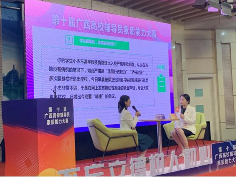 本次大赛为期三天,包括基础知识测试、谈心谈话、案例研讨三个环节。此次大赛实现全面对标对准全国辅导员素质能力大赛的新规则与要求,旨在考察辅导员的职业化、专业化能力。本次大赛共有广西各高校选派的81名辅导员参赛。通过精彩和激烈的同台竞技,我校辅导员韦唯凭借扎实的理论功底、缜密的逻辑思维和流畅的语言表达取得佳绩。