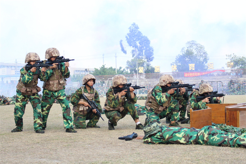 随后,一场军味兵味浓战斗气息强的会操正式拉开了序幕。广大“新兵”以朝气蓬勃、奋发向上的精神风貌进行了分列式展示,喊着嘹亮的口号,踏着整齐的步伐,依次经过主席台前,完成立正、跨立、稍息,停止间转法、蹲下与起立等内容,一招一式,整齐划一,为新起点、新学期交上了一份圆满的军事技能训练答卷,紧接着进行精彩的擒敌拳、匕首操、刺杀操、战场救护、战术展示等军训表演科目展示,新生们飒爽的英姿、娴熟的动作赢得了在场观众阵阵欢呼和掌声。