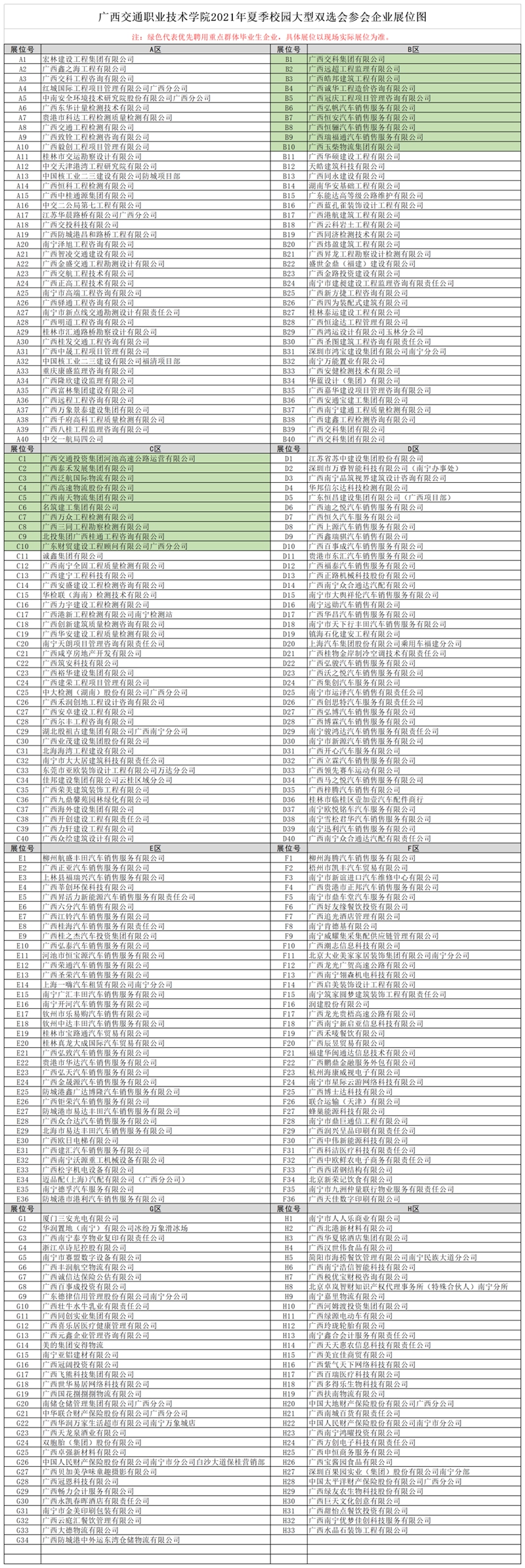 同时,积极与广西交科集团有限公司、广西交通投资集团河池高速公路运营有限公司、广西远超工程监理有限公司、广西泰禾发展集团有限公司、广西泛航国际物流有限公司、广西玉柴物流集团有限公司等20家企业协商,优先帮扶重点群体毕业生,提供优先推荐、招聘岗位服务,确保毕业贫困生就业“无压力”。