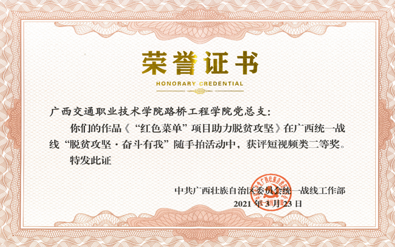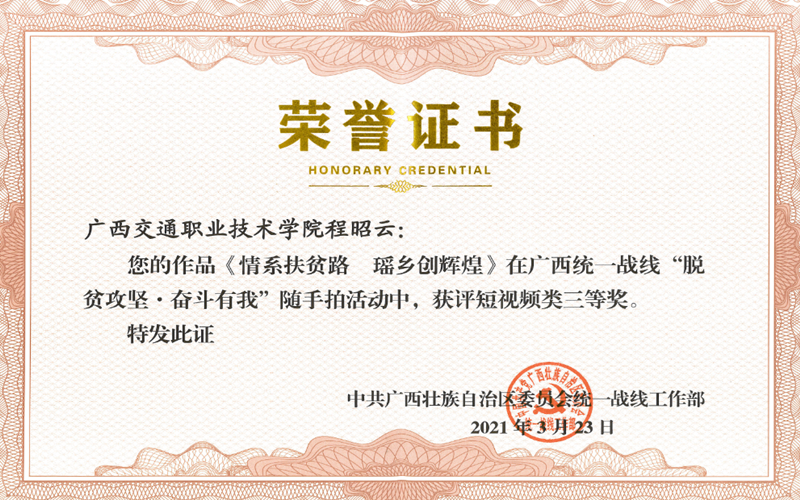 (党委统战部 讯 潘华莹/文)近日,我校选派的参赛作品在广西统一战线“脱贫攻坚·奋斗有我”随手拍活动中荣获短视频类二等奖1项、三等奖1项。
