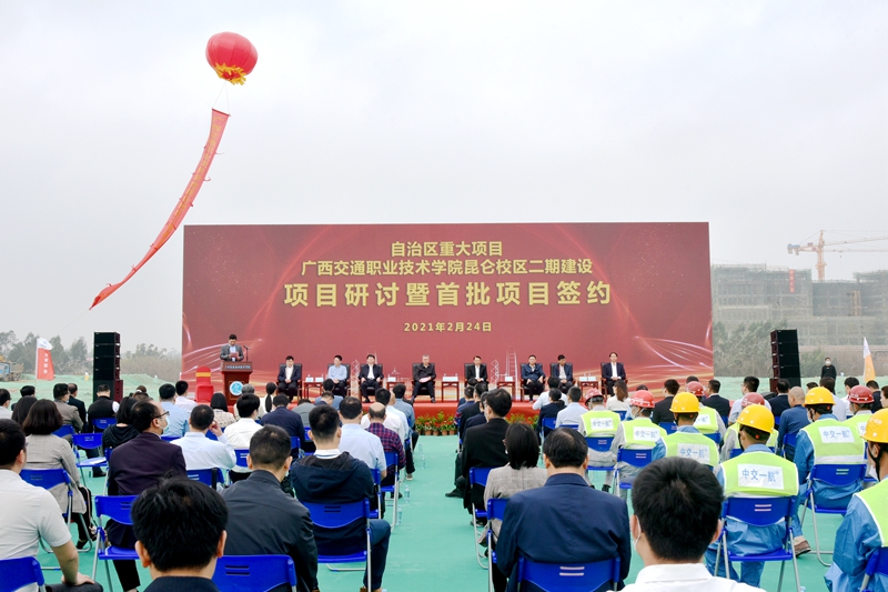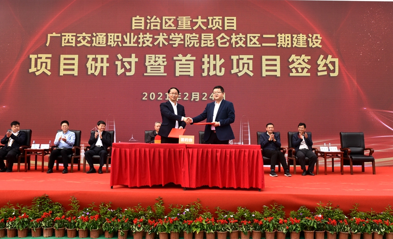 (党委宣传部 讯 陆丽程、苏江/文、图)风来潮起,自当扬帆破浪;任重道远,更需策马加鞭。2月24日上午,自治区层面统筹推进重大项目——广西交通职业技术学院昆仑校区二期建设项目研讨暨首批项目签约仪式,在我校昆仑校区东区施工现场18#楼区域隆重举行。中交第一航务工程局有限公司总经理由广君,自治区交通运输厅党组成员、副厅长胡华平,自治区发展改革委社会发展处处长许伟,自治区教育厅职成处处长覃壮才以及我校领导班子等共同出席本次仪式。学校党委书记温宗胤主持仪式。