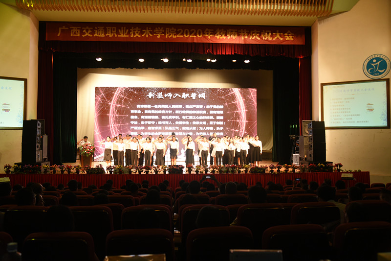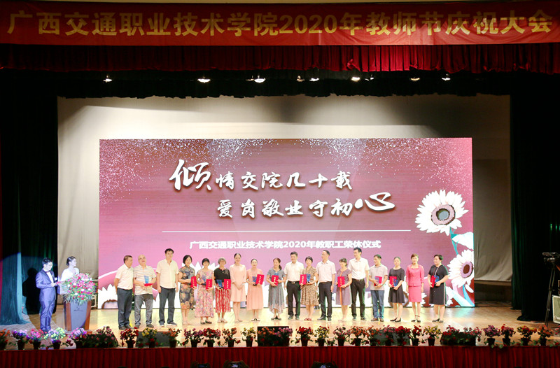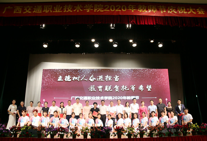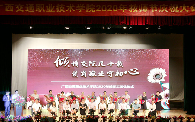 (党委宣传部 讯 陆丽程/文 苏江、张丽梅、陆丽程/图)立德树人奋进担当,教育脱贫托举希望。9月10日晚,我校在园湖校区大礼堂隆重举行了2020年教师节庆祝大会。学校党委书记温宗胤致辞。大会进行了退休教职工荣休仪式、新教师入职宣誓仪式、“奋进交院人”风采展、师生献礼文艺表演。学校党委书记温宗胤、校长李文勇、党委副书记莫海燕、副校长韦红教、陈海峰,纪委书记麻新桃、总会计师谭雄出席活动,全校教职工参加了本次庆祝大会。