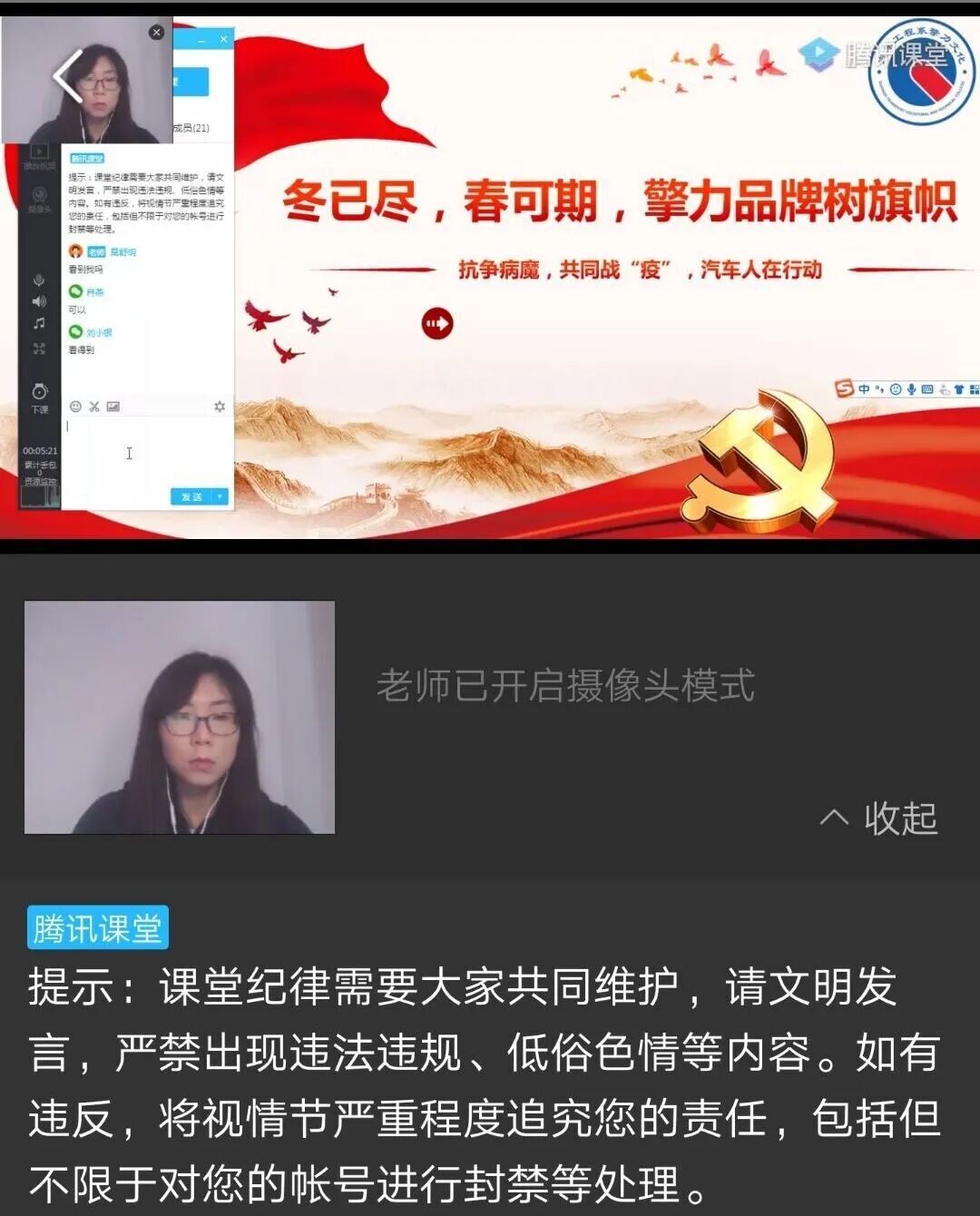 思政部教师在线上教学第一天播放了“思政课战疫小课堂”系列微课之一:《信心、责任、担当——同舟共济,共抗疫情》微课,饱含深情勉励同学们在抗击疫情的战役中自我成长,与时代同行,与祖国同在。同学们反映热烈,在感动中感悟、在感悟中成长,激起了他们铭记使命和责任担当的决心和激情。