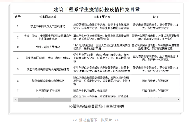针对系部2912名学生每日大数据防控排查,系部结合信息技术手段,严密布控,提效保质,逐步形成制度化、数字化、网格化、规范化工作管理模式,打造 “领导—干事—辅导员—班级导师、任课教师、实习指导教师”横线,“系部—班级—班干—宿舍—个人”纵线,形成横纵贯通的管理体系;实行“人盯人”“一对一”防疫机制,建立了18项一级档案目录等,使排查防控工作全面高效高质进行,为全面打好防疫阻击战奠定坚实基础。