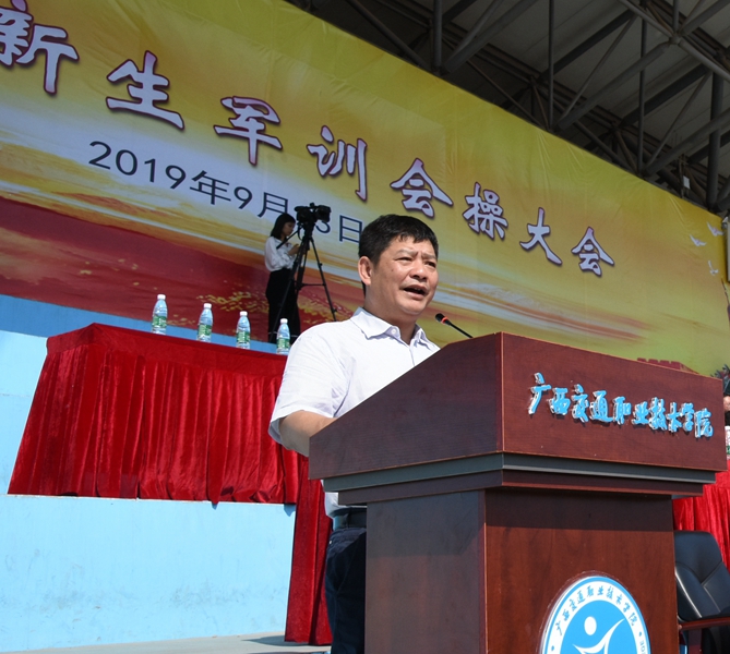 温宗胤书记在大会上作了讲话。首先代表学院党委和行政向敢于挑战自我、刻苦磨练意志、圆满完成军训任务的2019级全体新同学表示亲切的慰问和祝贺,向奋战在一线的军训教官和工作人员表示衷心的感谢和诚挚的问候,并希望全体新同学在今后的大学生活里要以学习为己任,把军训中激发出来的团结、拼搏、进取的精神带到今后的学习生活中。他向全体新生提出了三点希望:一是要把爱国爱军、担当敢为、攻坚克难的优秀品质,不断内化为自己成长成才的动力;二是要严于律己,遵规守纪,要树立集体观念,团队意识,争做文明、优秀的交院学子;三是要继续发扬“不抛弃、不放弃”的亮剑精神,保持艰苦奋斗、顽强拼搏的优良作风,以奋斗逐梦新时代。最后他希望同学们始终秉承“志存高远、改革创新、担当实干、追求卓越”的交院精神,勤奋学习,立德修身,把自己培养成为德才兼备、全面发展的高素质技能人才,以更优异的成绩喜迎新中国成立70 周年!