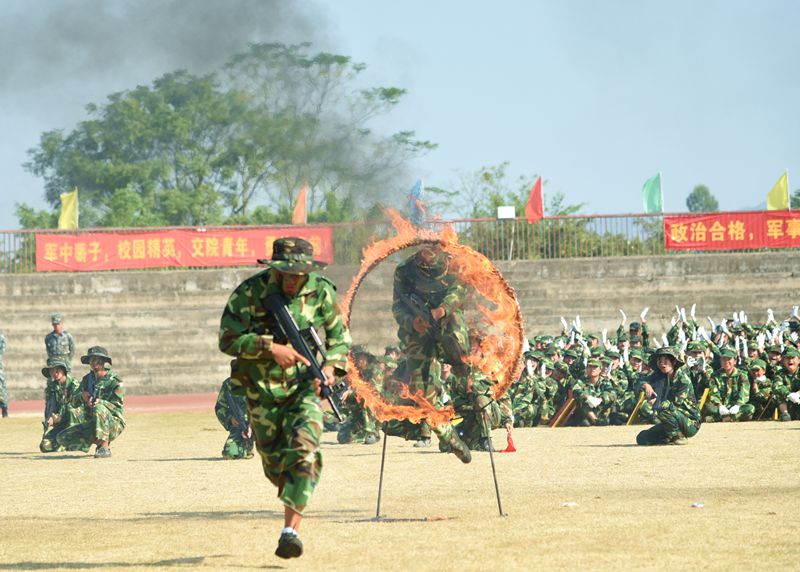 大会最令人振奋的莫过于由三营(管理系)近千名同学组成的大方阵进行队列操表演,同学们以整齐划一的动作变幻出各种造型,震撼全场。还有惊险刺激的战术表演,配合烟雾弹、震爆弹、火圈等,高度还原战场实况,场面震撼,同学们不畏困苦勇猛持枪行进,单腿跪姿射击、前滑转身射击等战术动作,向大家展示了枪战术精神和各种枪战技巧,让人眼前一亮,点燃全场。其他2个方阵的刺杀术、棍术表演也十分精彩,赢得了现场阵阵喝彩,最后在响亮的“志存高远、改革创新、担当实干、追求卓越”的交院精神口号声中圆满完成军训会操表演。