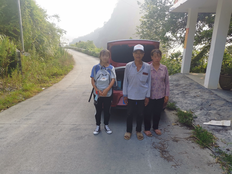 清晨,兰莉花在村口与父母合影,踏上了前往南宁的求学之路