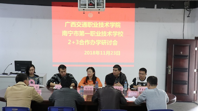 (交通信息工程系 讯 孙 坚/文、图) 为了进一步推动中高职信息技术类专业协调发展,实现中职教育与高职教育的有机衔接。11月23日,我院与南宁市第一职业技术学校举行了“2+3”合作办学研讨会暨签约仪式。我院招生就业处、交通信息工程系负责人及南宁市第一职业技术学校相关负责人参加了研讨会。