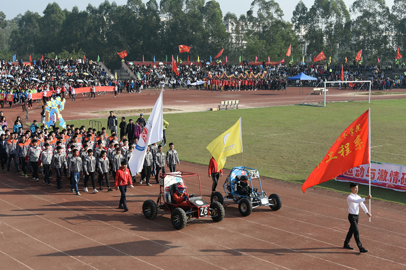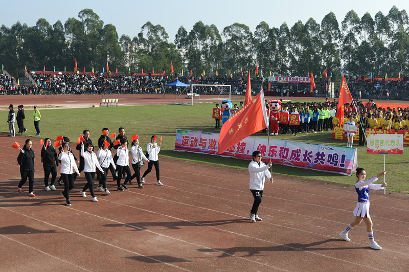 在激昂向上的《运动员进行曲》旋律中,国旗、院旗、会旗护卫队率先进场,随后,各系部仪仗队、学生运动员代表队及教职工代表队按照既定序列入场。各代表队迈着有力的步伐,喊着响亮的口号,依次通过主席台,彰显青春风采。