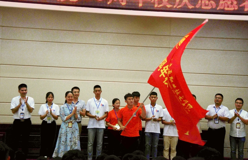 誓师大会上,莫海燕副书记代表学院向校庆志愿者代表授志愿者服务团旗。