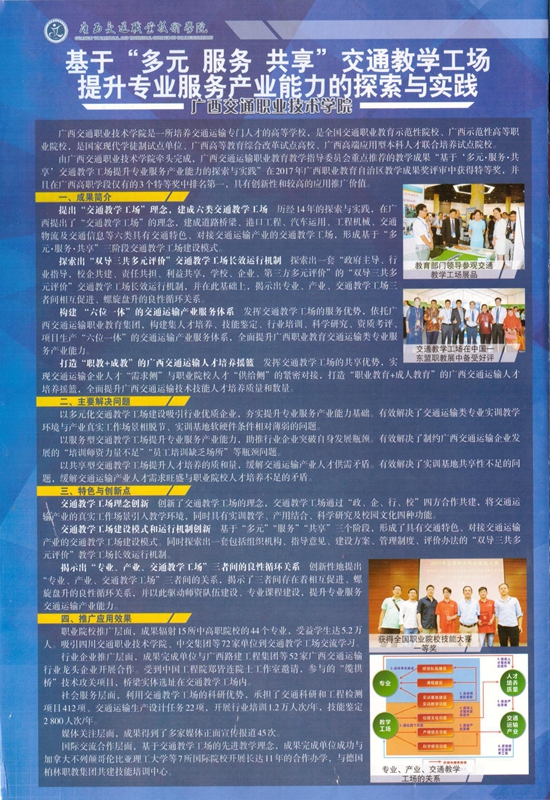 《中国职业技术教育》(2018年第6期)推介了我院2017年获得的广西职业教育教学成果特等奖——《基于“多元 服务 共享”交通教学工场提升专业服务产业能力的探索与实践》,从成果简介、主要解决问题、特色与创新点、推广应用效果等方面进行了详细介绍,充分展示了我院对接交通运输产业的交通教学工场在教育教学、人才培养、科学研究、服务产业等方面发挥的重要作用。