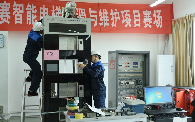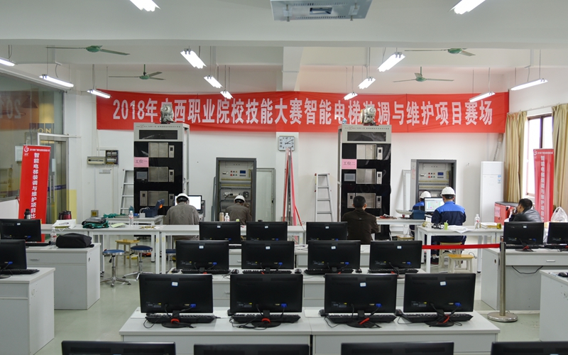3月26-27日,2018年广西职业院校技能大赛智能电梯装调与维护赛项(高职组)在学院四塘校区开赛。本次比赛为团体赛,采用理论、技能相结合的方式同步进行。比赛中,每个参赛队的比赛时间为5小时,参赛选手需合理安排理论和技能竞赛时间,完成1份理论试卷,并在指定场地进行电梯控制技术综合实训操作,协同完成电梯电气控制原理图设计与绘制、电梯机构安装与检测装置调整、电梯电气控制柜器件的安装与线路连接、电梯控制程序设计与调试、电梯故障诊断与排除和电梯运行调试与保养。各参赛队严格遵守赛事安排,克服了赛时长、赛项任务重、操作工序难等各类因素,认真完成了竞赛内容。
