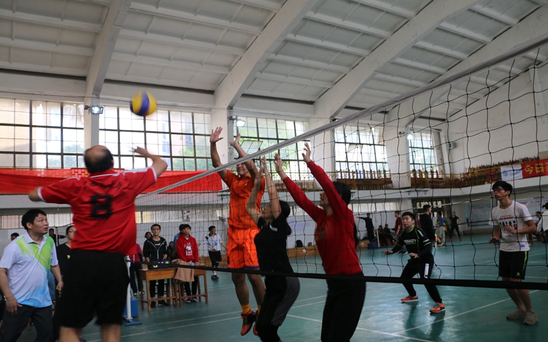 比赛一开始,双方很快进入状态,攻防节奏转换很快,进攻犀利、防守严密,比分咬得很紧。赛场上呐喊声、助威声也不绝于耳。场上队员中有刚刚入校的青年教师,有常年参加此类赛事的知名教授,各代表队运动员配合默契、团结协作。赛场上的队员们有的凶猛发球击中对方防守空挡,有的跳起拦网吊球,有的后排轮番进攻。参赛队员迅猛的发球、巧妙的拦网、精彩的扣杀使得整个比赛跌宕起伏、精彩纷呈。