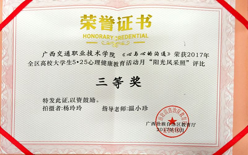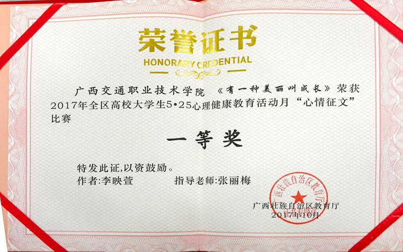 (学生工作处 团委 讯 唐锋、关文莉/文)近日,自治区教育厅公布了2017年全区高校大学生5·25心理健康教育活动月主题活动获奖名单。我院管理工程系学子参赛作品《有一种美丽叫成长》喜获大学生心理健康教育“心情征文”项目一等奖,航海工程系学子参赛作品《心与心的沟通》喜获“阳光风采照”项目三等奖。