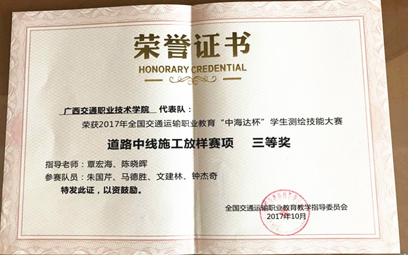 (路桥工程系 讯 李振成/文) 近日,由全国交通运输职业教育教学指导委员会主办、路桥工程类专业指导委员会承办的2017年全国交通运输职业教育“中海达杯”学生测绘技能大赛在四川交通职业技术学院落下帷幕。我院路桥工程系学生代表队在比赛中喜获一项二等奖、两项三等奖。