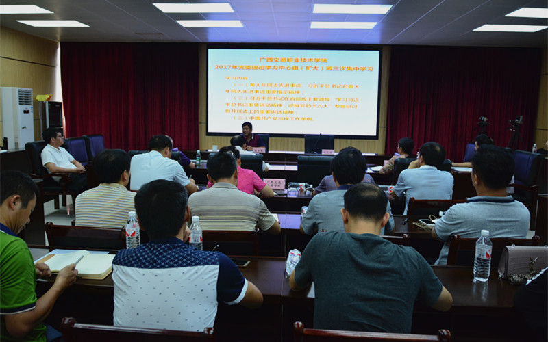 讯 张丽梅、黄福秀/文 张丽梅/图) 9月29日,学院召开党委理论学习中心组(扩大)第三次集中学习会。学院党委书记温宗胤,院长程轮,党委副书记、纪委书记莫海燕,副院长黄琼念、韦红教、陈海峰,总会计师谭雄,全院中层领导干部以及广西交通运输学校领导班子成员参加了学习会。会议由党委书记温宗胤主持。