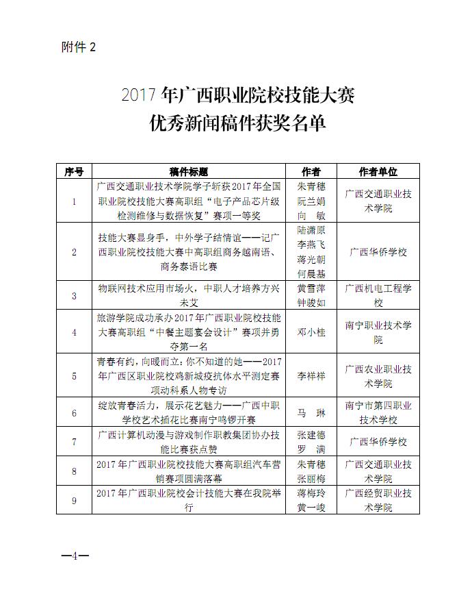 (党委工作部 教务处 讯)根据教育厅《关于公布2017年广西职业院校技能大赛优秀摄影作品、优秀新闻稿件获奖名单的通知》(桂教职成【2017】22号)的文件,学院选送的《广西交通职业技术学院学子斩获2017年全国职业院校技能大赛高职组“电子产品芯片级检测维修与数据恢复”赛项一等奖》、《2017年广西职业院校技能大赛高职组汽车营销赛项圆满落幕》2篇新闻稿件脱颖而出,荣获2017年广西职业院校技能大赛优秀新闻稿件奖项。