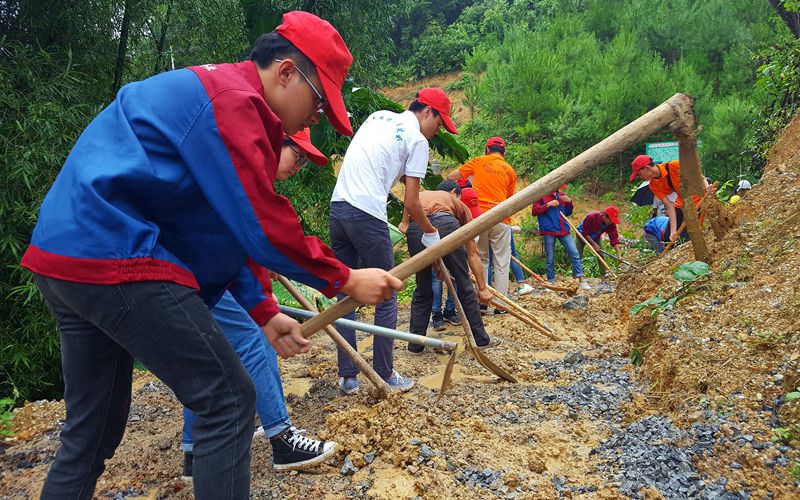 抢修道路当天时晴时雨,志愿者们身上又是雨又是汗。在党员老师的带领下,学生骨干们热情高涨,专注挖泥填石铺路,经过半天的努力终于完成修路。信河村党支书卢荣桥说:“农忙期间,村‘两委’换届时间紧、任务重,下雨塌方把通往三乌鸡养殖场的路堵了,我们几个村干一直没有办法抽出时间去修路,眼看着运料车上不去,我们心里着急啊!没想到我们的大学生干起活来如此实在,我代表村民谢谢同学们为村里做实事!”