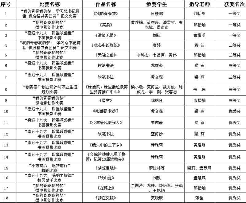 翰墨颂盛世”书画摄影大赛一等奖;由刘恬甜老师指导,何桂鹏撰写的《我的青春梦》在“我的青春我的梦——学习总书记讲话 做合格共青团员”征文比赛中荣获一等奖。此外,我院学子积极参加了