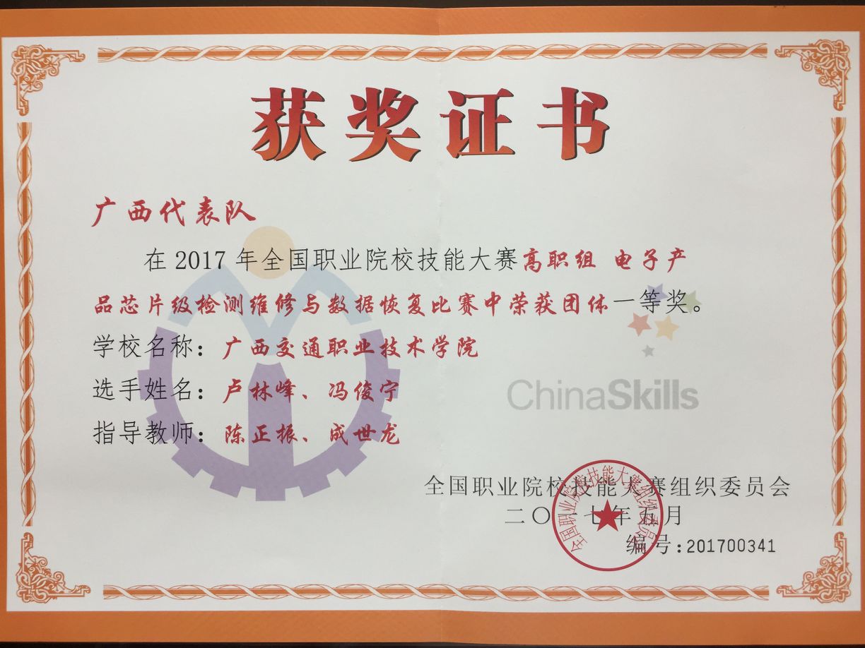 “电子产品芯片级检测维修与数据恢复”全国一等奖获奖证书