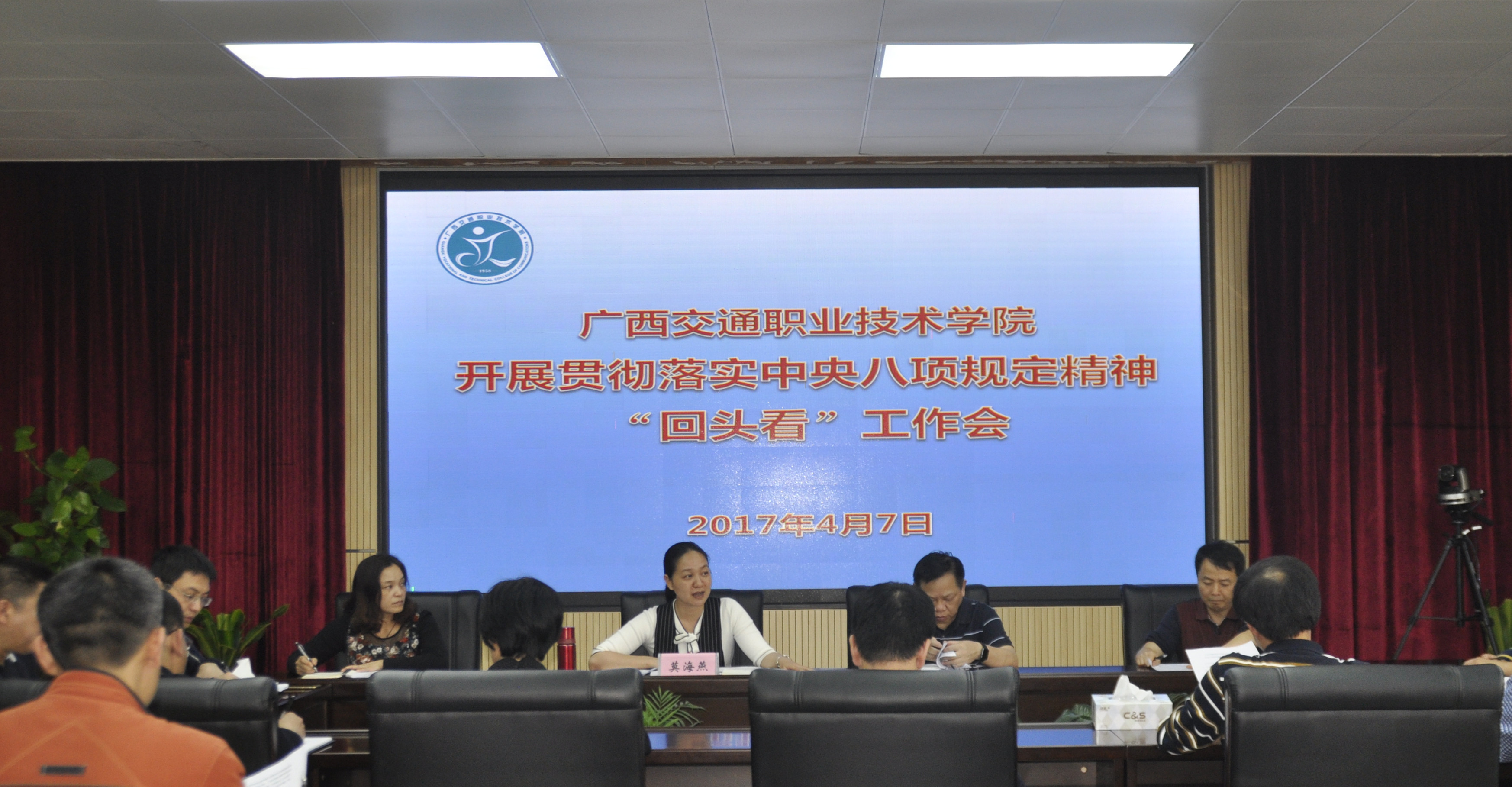 (党委工作部 讯 梁友佳/文、图)4月7日下午,我院贯彻落实中央八项规定精神“回头看”工作会在四塘校区管理楼五楼会议室召开,会议由学院党委副书记、纪委书记莫海燕同志主持。学院有关职能部门、广西交通运输学校的相关负责人参加了会议。