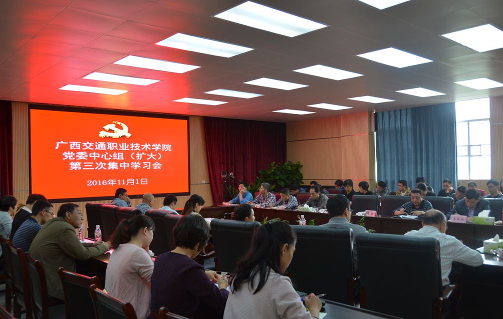 (党委工作部 讯 梁友佳/文、图)11月1日下午,我院在四塘校区管理楼五楼会议室召开党委理论学习中心组第三次集中学习(扩大)会议。学院党委书记温宗胤,院长程轮,党委副书记、纪委书记莫海燕,副院长黄琼念、韦红教、陈海峰,总会计师谭雄, 以及全院中层领导干部参加了学习会。