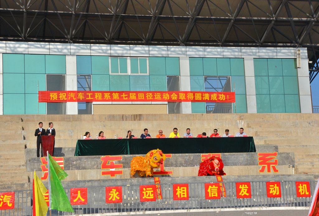 (汽车工程系 林波/文 覃晓涓/图)“比拼激扬梦想,搏击磨砺锋芒”,当两头虎虎生风的醒狮口中吐出条幅,田径场顿时掌声雷动。近日,汽车工程系第七届田径运动会开幕式在四塘校区田径场隆重举行,学院副院长黄琼念出席开幕式并致辞。