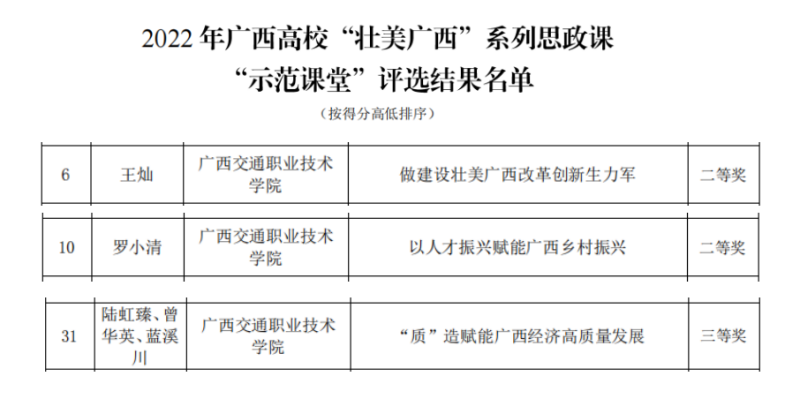 日前,自治区党委教育工委、自治区教育厅下发了《关于公布2022年广西高校“壮美广西”系列思政课“示范课堂”评选活动结果的通知》,我校推送的两堂思政课荣获二等奖、一堂思政课荣获三等奖。