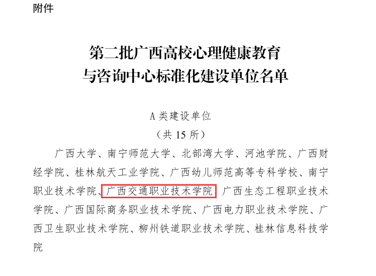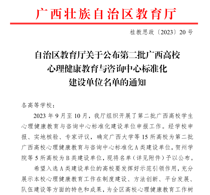 (学生工作部 讯 樊毓美/文)近日,自治区教育厅公布第二批广西高校心理健康教育与咨询中心标准化建设单位名单,我校成功获评A类建设单位。