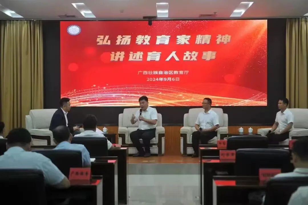 教师节前夕的南宁,自治区教育厅26楼视频会议室, 一场“弘扬教育家精神,讲述育人故事”活动在这里举行,我校教师刘学军、廖俊生、许松受邀参加现场访谈,分享“匠心育人、师徒传承”的职教故事。