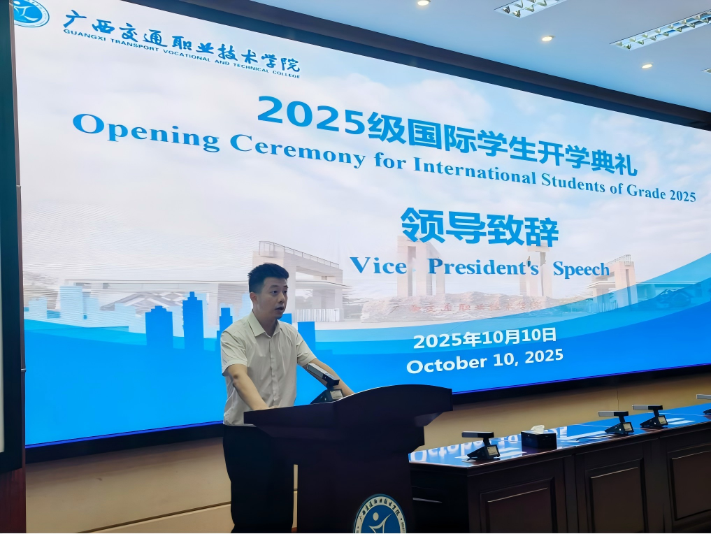 在典礼上,邱实副校长对新生的到来表示热烈欢迎。他指出,作为广西高校来华留学教育工作优秀单位,学校依托“四高四优”八大交通特色专业群,为留学生搭建了“中文+职业技能”的国际化培养平台。今年学校首次招收语言进修类留学生,总共招收122名国际新生,数量创历史新高。