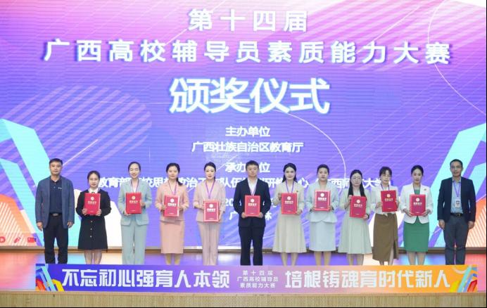 本次大赛汇聚了全区80余所高校的110余名优秀辅导员同台竞技,本次比赛分“赋能成长”和“实战演练”两个单元,共设置赋能微课、基础知识测试、学情分析、案例研讨、谈心谈话五个环节。全面考察辅导员的理论素养、专业能力和育人智慧,是广西高校辅导员队伍建设水平的年度“大检阅”。经过三天的激烈角逐,我校辅导员王清华老师凭借扎实的理论功底、精准的学情研判能力和灵活的育人技巧脱颖而出,荣获大赛一等奖;董小夏老师以沉稳的临场表现、深刻的案例剖析和温暖的沟通方式赢得评委青睐,斩获二等奖。