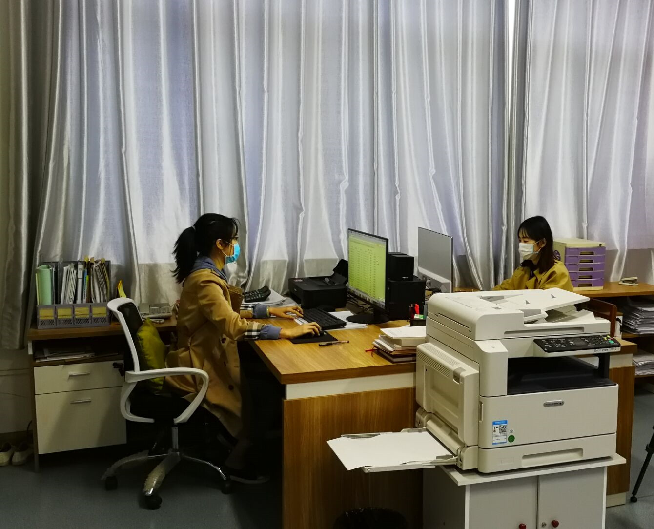 学工、团委的杜晓莲老师(左)、樊毓美老师(右)做好学院16000多名学生的排查联络,并组织为家庭经济困难学生发放学习生活补助