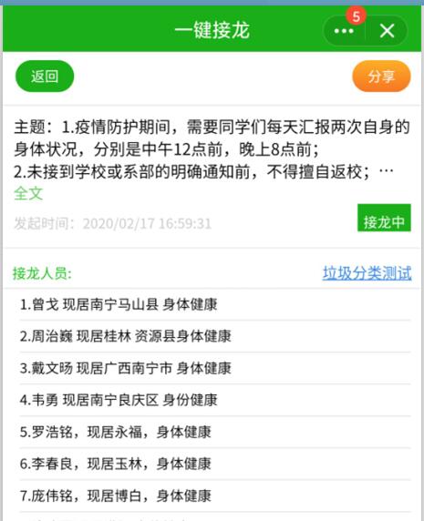 与此同时,通过在线主题班会、微信群、班级QQ等渠道,确保每位学生及时了解关于疫情防疫相关信息。进行有针对性的宣传,多次强调未经允许不得提前返校、提前返岗的相关要求,教育和引导学生积极配合当地政府的安排,不去走亲访友、?不让亲朋好友来串门,居家做好自我防护措施,适当锻炼身体,保持良好的作息和饮食习惯,提高自身免疫力。