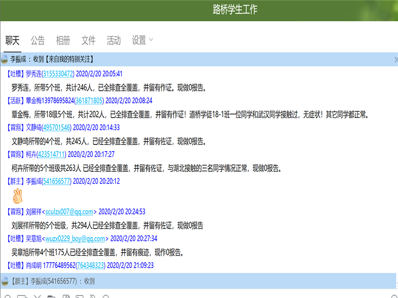 防控工作开展以来,路桥工程系通过QQ、微信等方式传达上级?学院关于疫情防御工作的部署安排,进一步提高师生对于疫情防控严峻形势和防控重要性的认识,将师生员工对疫情防御的思想认识统一到上级和学院工作部署中来,形成防控工作合力。面对各类文件通知密集发布,信息报送随着疫情变化标准不断更新,路桥工程系要求各辅导员、各位教师细读研判,先仔细领会文件通知,理清工作要求和重点,再把文件要求清晰准确地传达到每位学生。