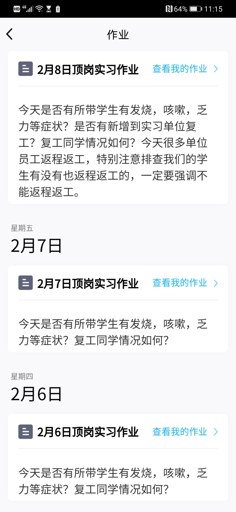 全体辅导员、班级指导老师在系部的统一领导下,第一时间结束寒假休假状态,开始网上办公、全员参与、全方位开展联防联控工作,迅速构建覆盖全系73个班级,3688名学生的疫情监控网。人在家,心在岗,各位辅导员保持24小时通讯畅通,每日通过钉钉健康打卡、在线文档、问卷星等多种方式坚持每日排查班级每位学生健康状况和区域动态,采取网络“人盯人”、“一对一”的方式,全面准确掌握学生动态,重点关注与确诊病例或疑似病例有过接触的学生;严格落实每日“两报”制度,从1月27日起,辅导员每天上午12点前、晚上20点前,按时上报学生排查状况上报;建立动态管理台账,每日对学生联防联控的数据进行查漏和分析,做到对每一名学生所在位置和健康状况清楚,做到关口前移,早发现、早报告、早隔离、早治?。