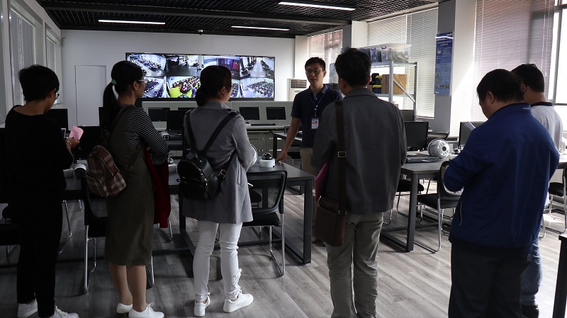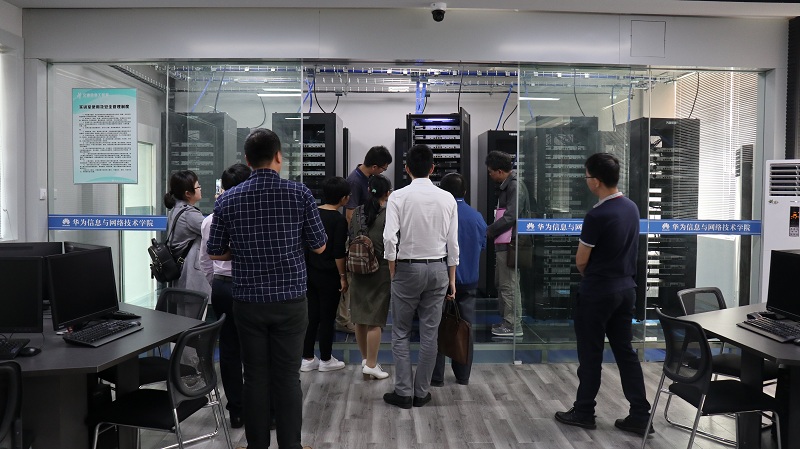 座谈会结束后,广西民族师范学院数学与计算机科学学院农修德副院长一行参观了华为信息与网络技术实训中心、数字化智能监控视频中心 、“360”创新创业实践中心等实训室。