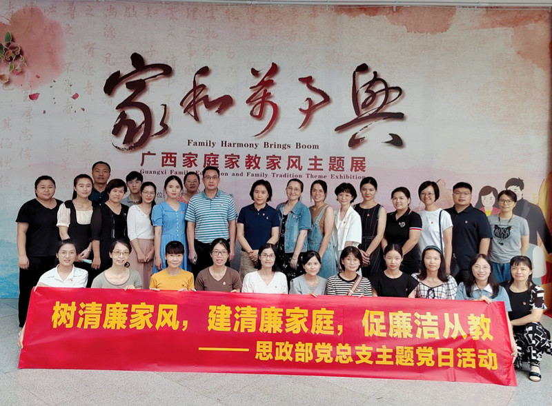 本次主题展以“风清气正”为主题,从历史人物、革命先辈和先进人物三个层次层层挖掘整合传统家风文化资源,突出展示广西的清廉家风文化,集中展示了党的十八大以来在家庭家教家风建设所取得的成效。党员同志们先后认真参观了“红色家风”“先贤家教”“清廉家庭”三个板块的展览,深刻学习中华传统优秀家风家训、革命先辈的家风文化及其先进人物的家风故事,领悟家庭家教家风对于国家发展、民族进步、社会和谐及个人成长发展具有的重要意义。