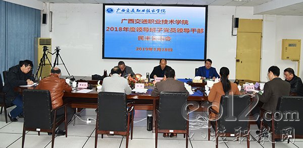广西八桂职教网讯(通讯员 张丽梅/文 苏 江/图) 1月18日,广西交通职业技术学院在园湖校区图书馆四楼会议室召开2018年度领导班子党员领导干部民主生活会。自治区交通运输厅党组成员、副厅长陆晓明,自治区交通运输厅直属机关党委专职副书记林奇茂,自治区交通运输厅科教处副处长张斯悦等领导全程参与指导,会议由学院党委书记温宗胤主持。