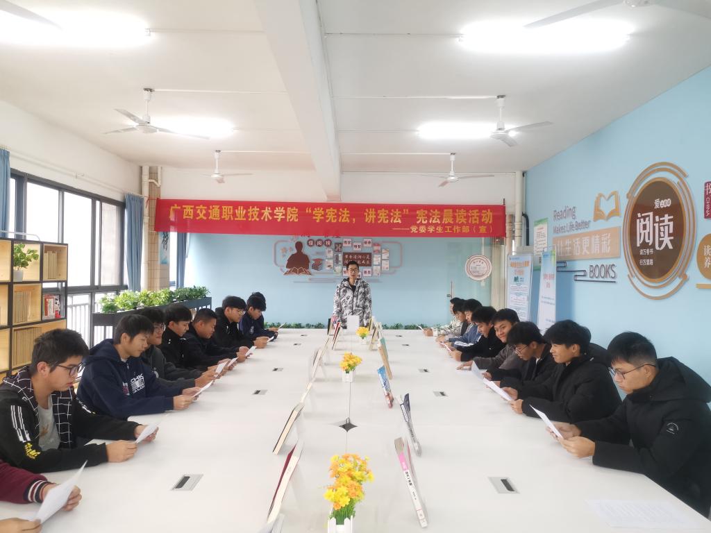 “任何公民享有宪法和法律规定的权利,同时必须履行宪法和法律规定的义务...”,12月4日上午,一阵阵洪亮的阅读声在国旗下、在润心书屋、在同心圆大学生思想教育基地和教室响起。各班通过主题班会开展“宪法晨读”活动、共同奏唱国歌、共同唱了“宪法伴我成长”歌曲和观看宪法宣传片,表达对宪法的敬意和热爱。