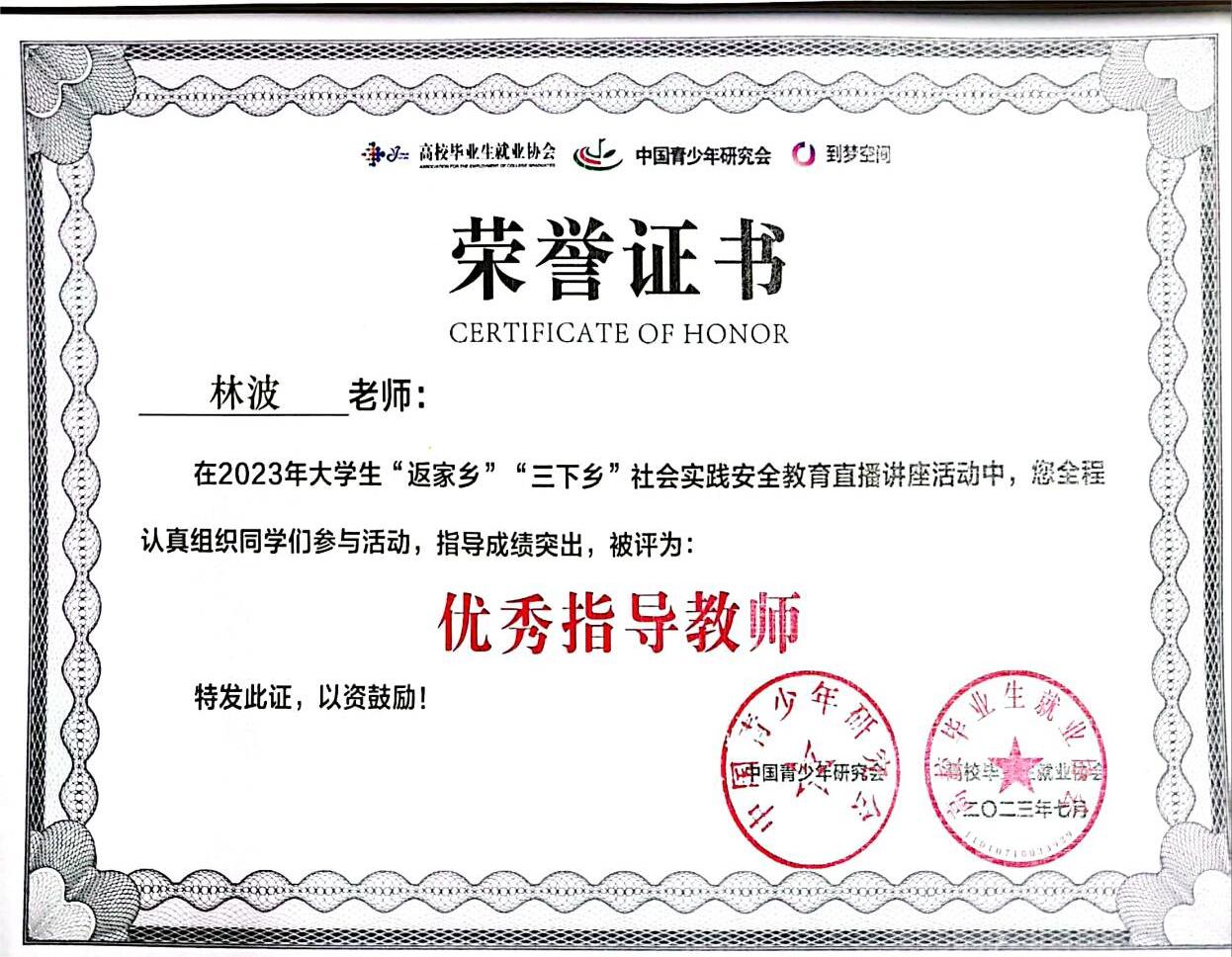 林波老师被高校毕业生就业协会、中国青少年研究会、到梦空间全国运营中心评选为优秀指导教师