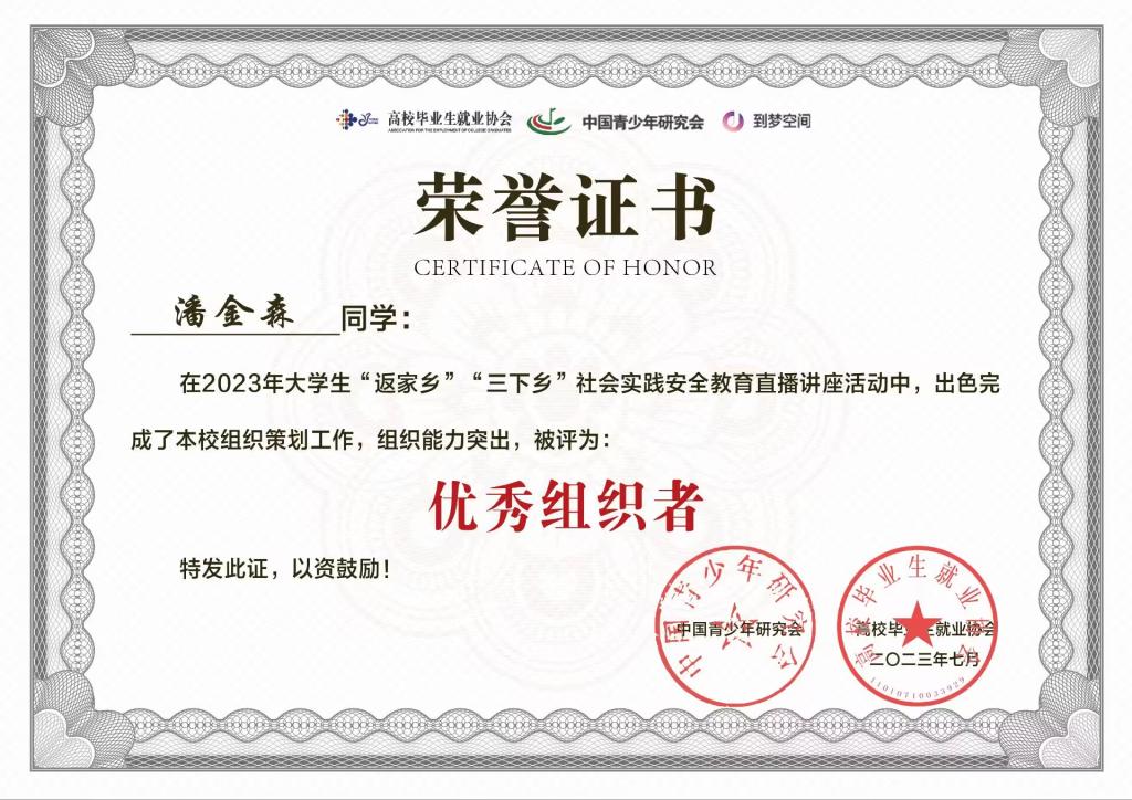 潘金森同学被高校毕业生就业协会、中国青少年研究会、到梦空间全国运营中心评选为优秀组织者