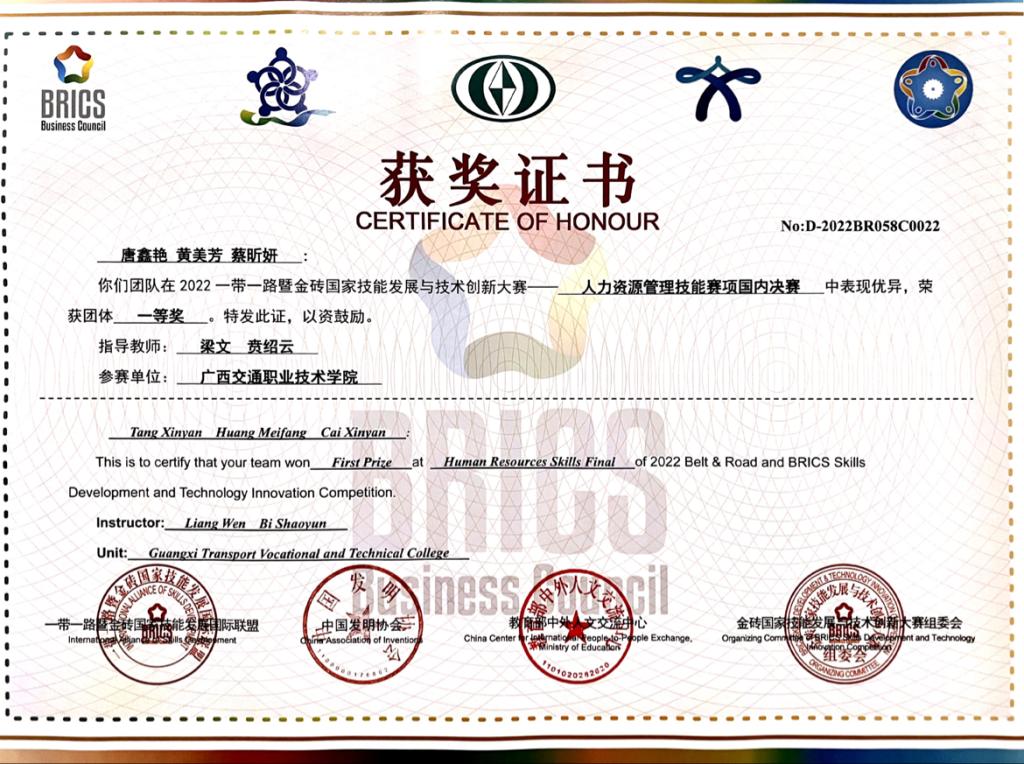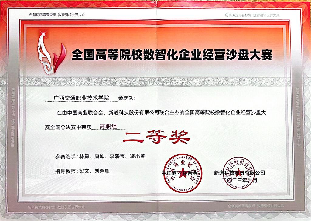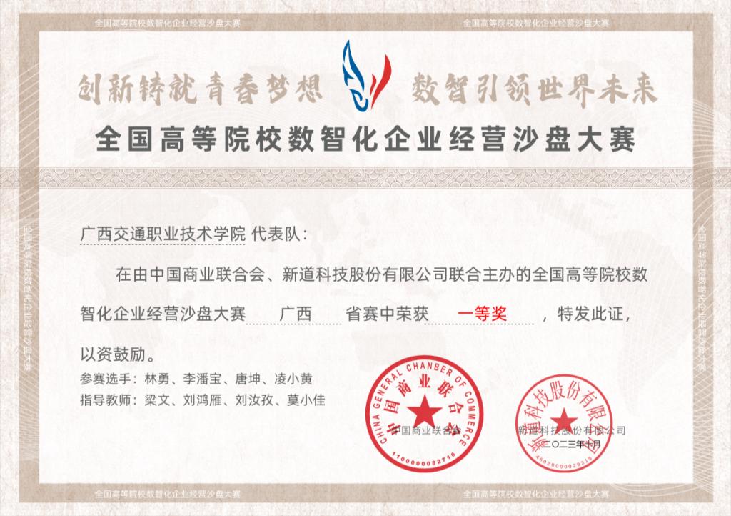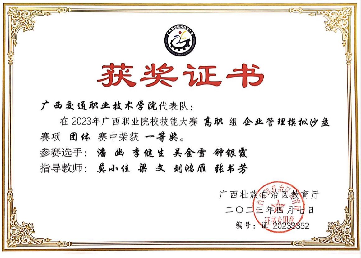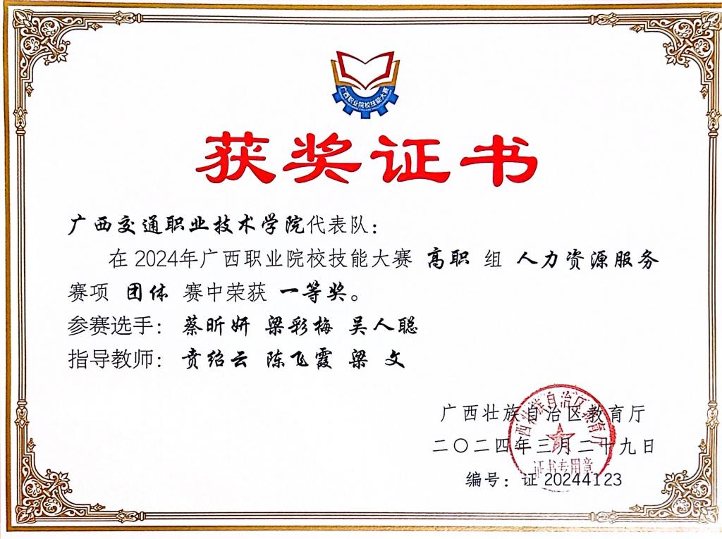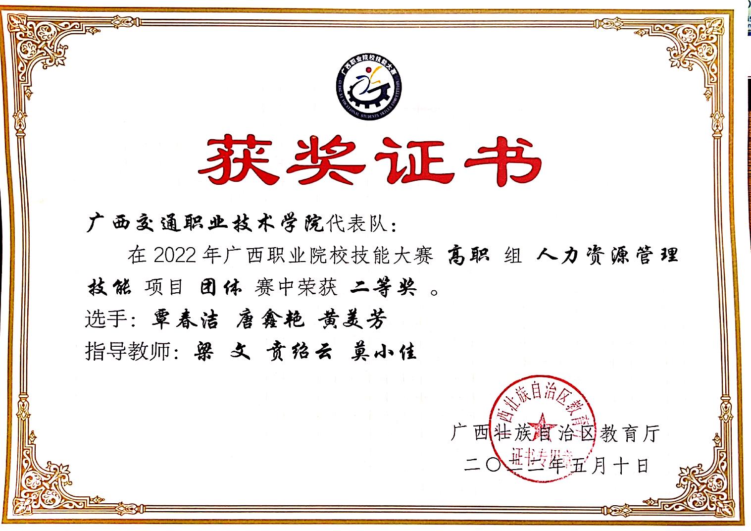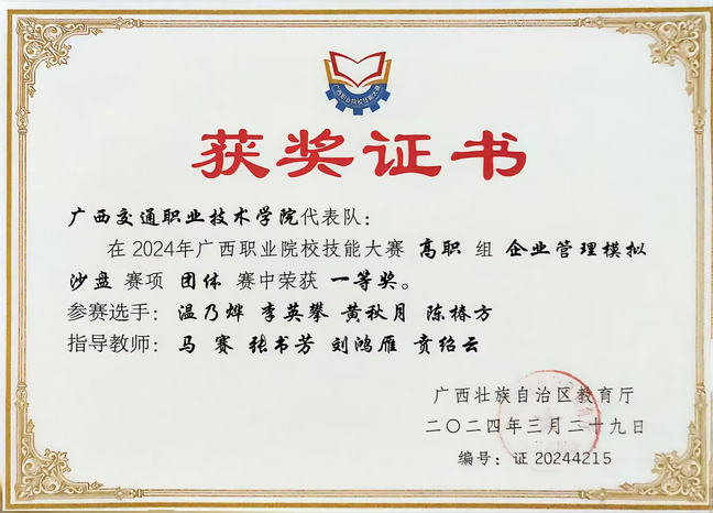基于2022年校内技能大赛的顺利举办,人力资源管理专业在2023年广 西职业院校技能大赛中取得了优异成绩,其中企业管理模拟沙盘赛项获全区一等奖,并在国赛中,为校出征,夺取标志性成果,荣获2023年全国职业院校技能大赛高职组企业经营沙盘模拟赛项三等奖,成为广西唯一一所在该赛项获得奖项的院校。同时,在2024年和2025年广西职业院校技能大赛中,专业获得一等奖2项、二等奖2项,金奖1项、银奖1项、铜奖2项。协会切实参与到专业人才培养质量提升以及专业建设发展的方方面面中,凝聚了协会成员的向心力,提高了学生对于专业的认可度和归属感。