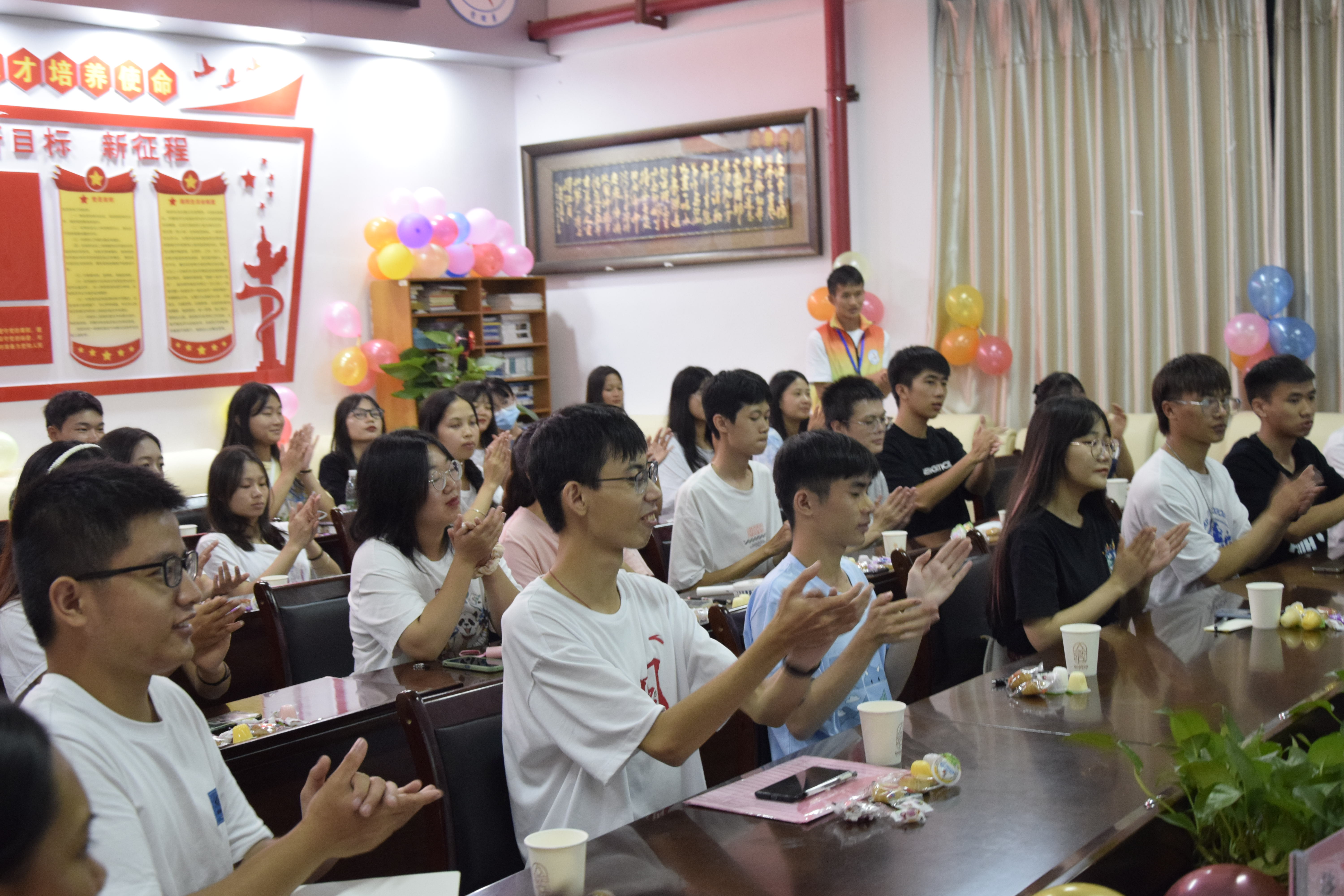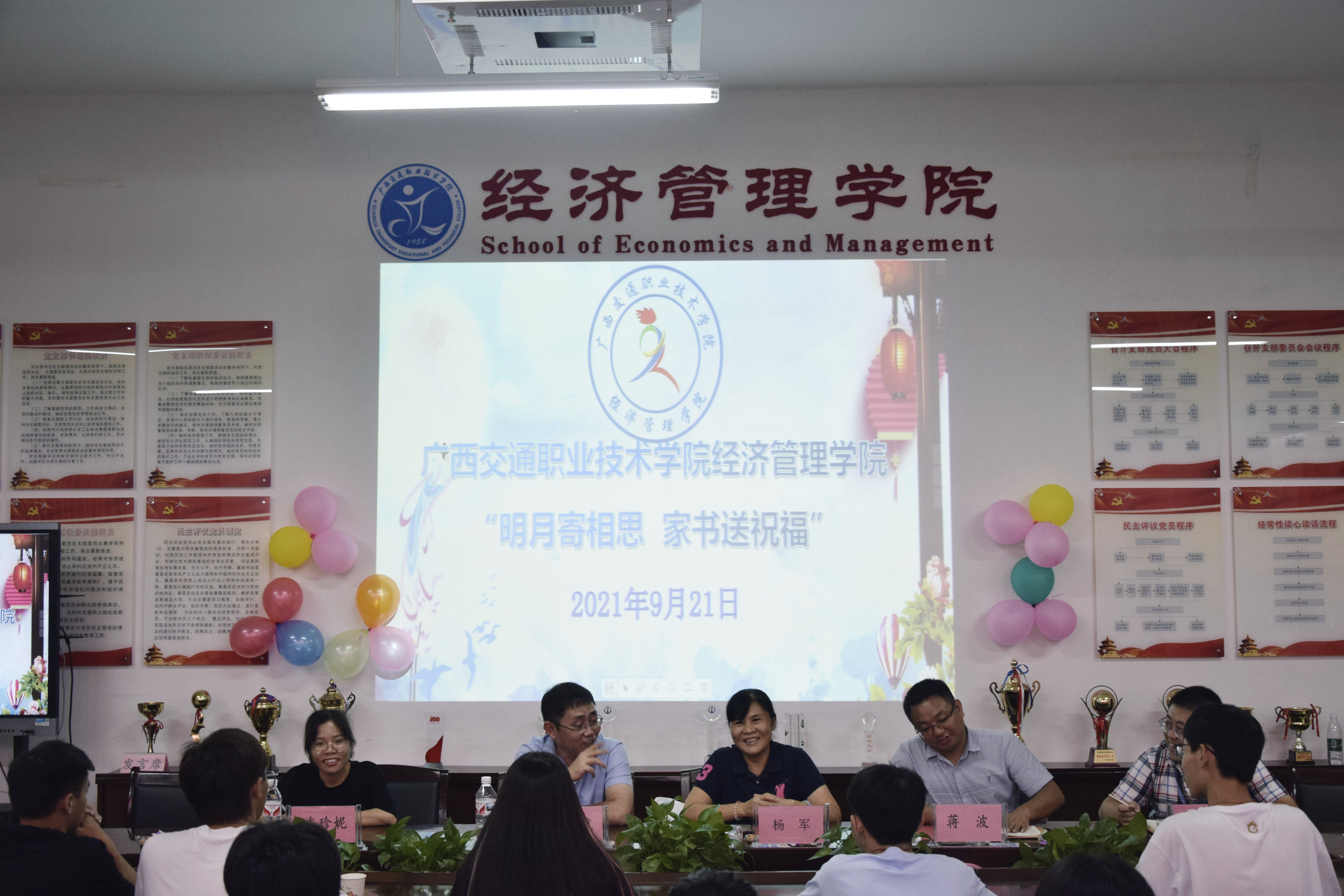 “明月寄相思,家书送祝福”中秋主题座谈交流会在管理楼316会议室举行,学院党总支部书记曹斌、院长杨军、党总支部副书记蒋波以及学生干事许彤、团总支书记韦珍妮和2021级各班新生代表参加了座谈会。蒋波副书记主持座谈并向同学们致以亲切的节日问候,诚挚祝愿同学们中秋快乐。紧接着,曹斌书记从同学们较为关切的住宿、餐饮和学习方面,与同学们进行深入交流,同时介绍学校的发展规划和专业发展情况。杨军院长就同学们关心的学习、就业等问题,与同学们进行深入交流,为同学们答疑解惑。并将从家里带来的月饼与同学们一起分享,祝愿同学们中秋快乐。