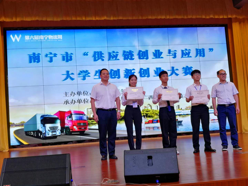 (管理工程系讯韦冬莉/文/图)5月25日,由南宁物流协会主办,广西机电职业技术学院承办的南宁市首届“供应链创新与应用”大学生创新创业大赛决赛在广西机电职业技术学院顺利举办。经过比赛激烈的角逐,由韦冬莉老师指导,物流管理专业2018级陈彩霞、隆昌成、黄宁俊、韦欣欣、唐婷5名同学共同完成的《最后一公里》项目获得一等奖;由李倩老师指导,市场营销专业2017、2018级的卢树雪、罗英杰、韦显景、班荣行4名学生共同完成的《智能植保助力终端销售实现产业化扶贫》项目获得优胜奖。