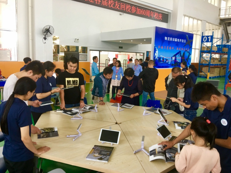 图片4 校友在智慧物流实训基地观摩学生技能展示,现场体验“未来课堂”教学设备