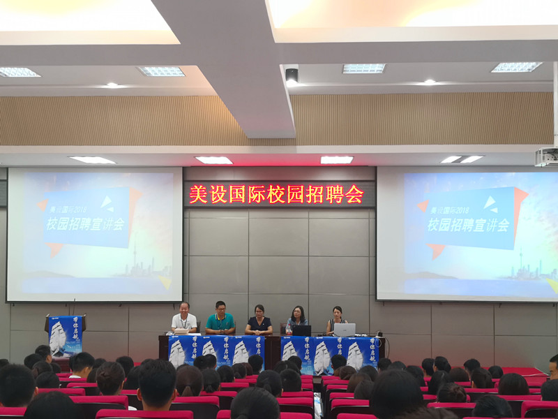 (管理工程系 讯彭燕文/图)5月7日晚19:00,“美设国际”国际货代有限公司校园招聘会在四塘校区综合教学楼第二学术报告厅举行,拉开了我系春季学期企业校园专场招聘会的序幕。参加本次校园招聘会的有“美设国际”华南行政经理杨蓉、深圳人事经理杨增彩、深圳人事主管邢丹玉,系就业干事贲绍云、辅导员耿兴云两位老师到场参加。本次招聘会分三个环节进行:校园招聘宣讲、分岗位接收简历、面试。